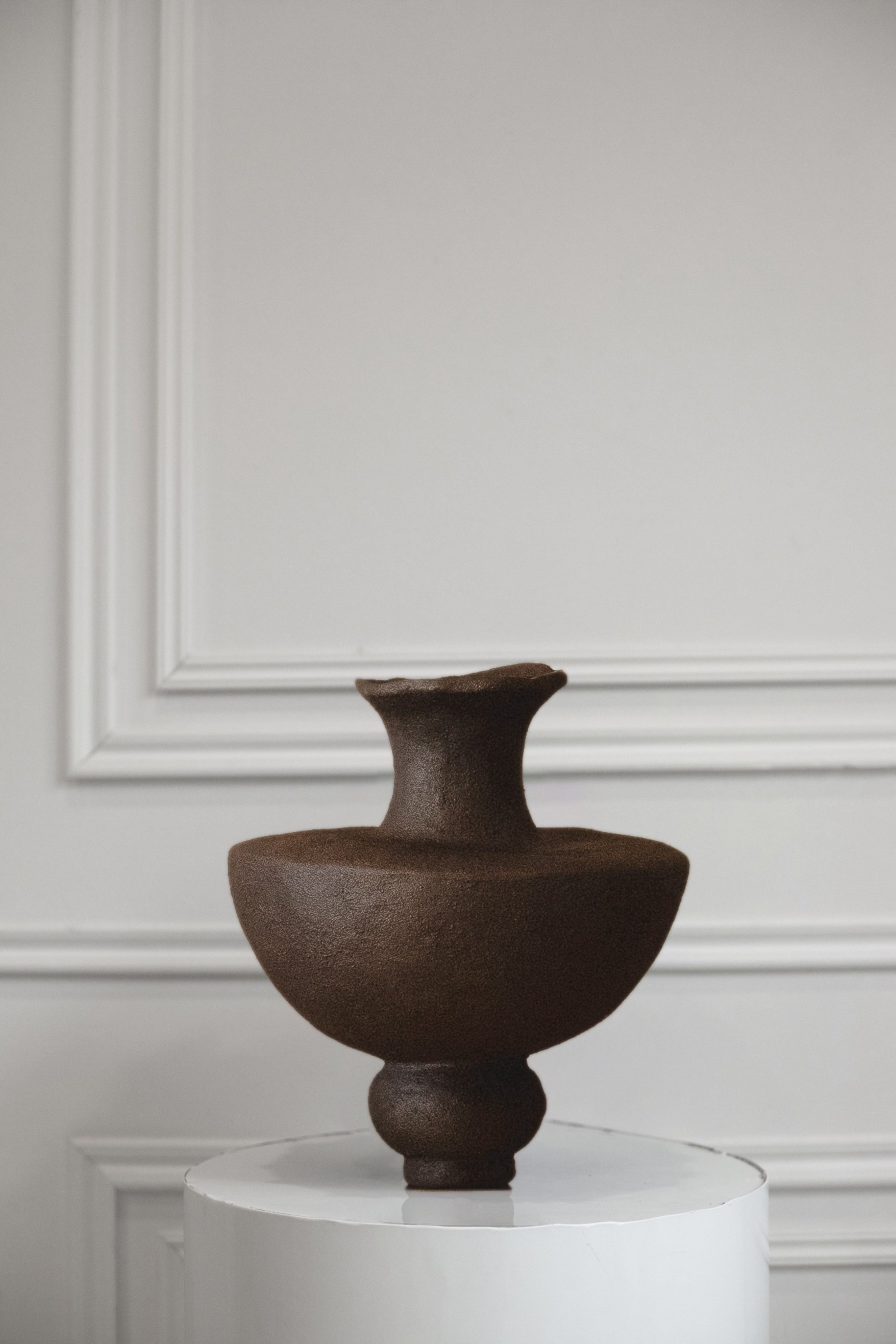 “Obsidian” draws inspiration from the sleek elegance of volcanic glass, with its deep brown hue and smooth, sculptural form. The gracefully curved silhouette, narrow neck, and flared lip create a refined balance and sophistication. Perfect for contemporary or minimalist spaces, its bold, dramatic presence contrasts beautifully with softer tones, adding a touch of timeless mystery and raw elegance to any interior.