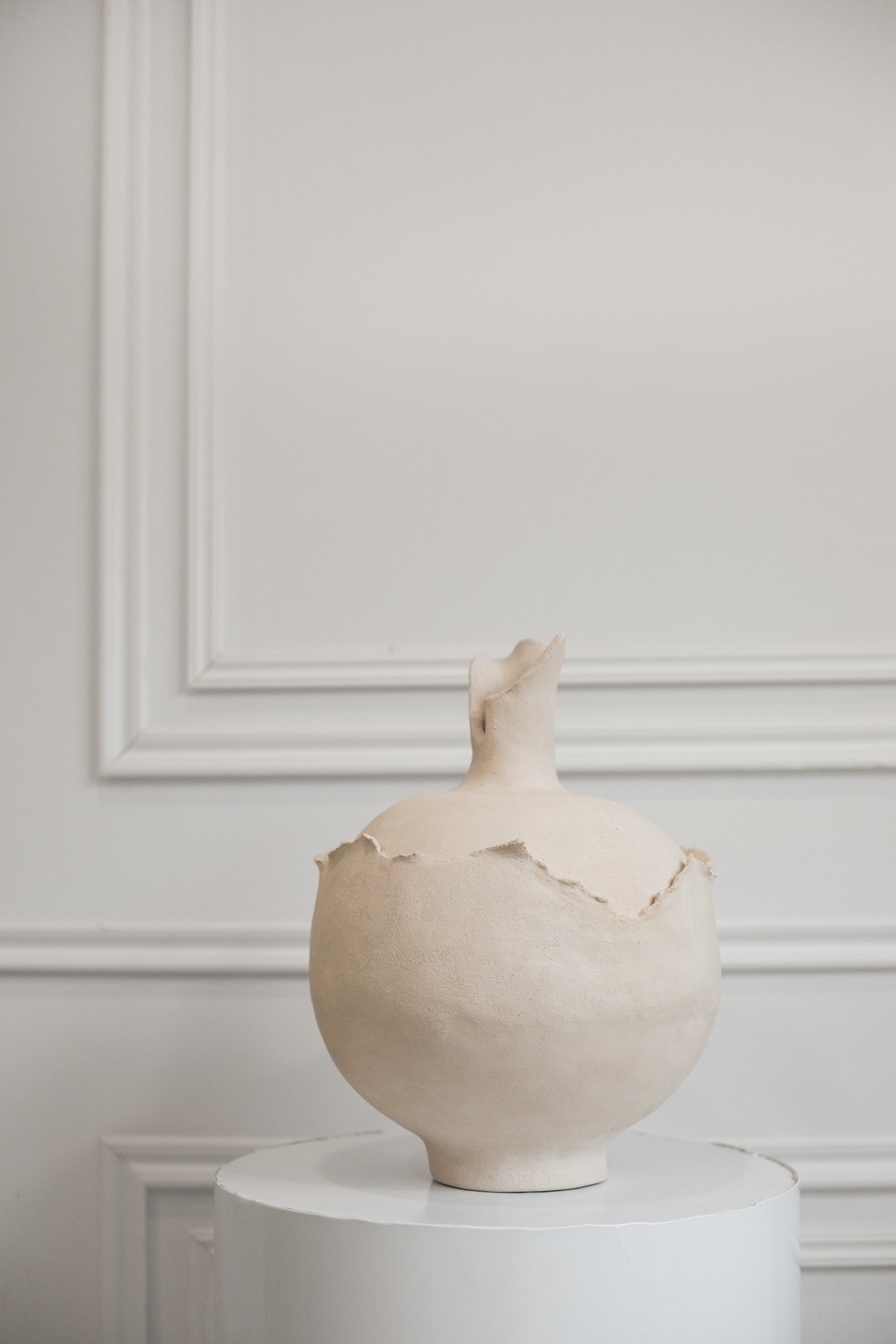 “Petrichor” evokes the earthy scent of rain-soaked soil, with its soft matte beige color and unique, weathered shape. The rounded body features a slightly irregular, torn edge, while the narrow neck rises with a subtle curve, adding raw, organic movement. Its earthy, rough texture resembles unpolished stone or clay, reinforcing its natural feel. Perfect for minimalist, rustic, or contemporary interiors, “Petrichor” brings organic warmth and an unrefined beauty that enhances any space with a calm, grounded presence.